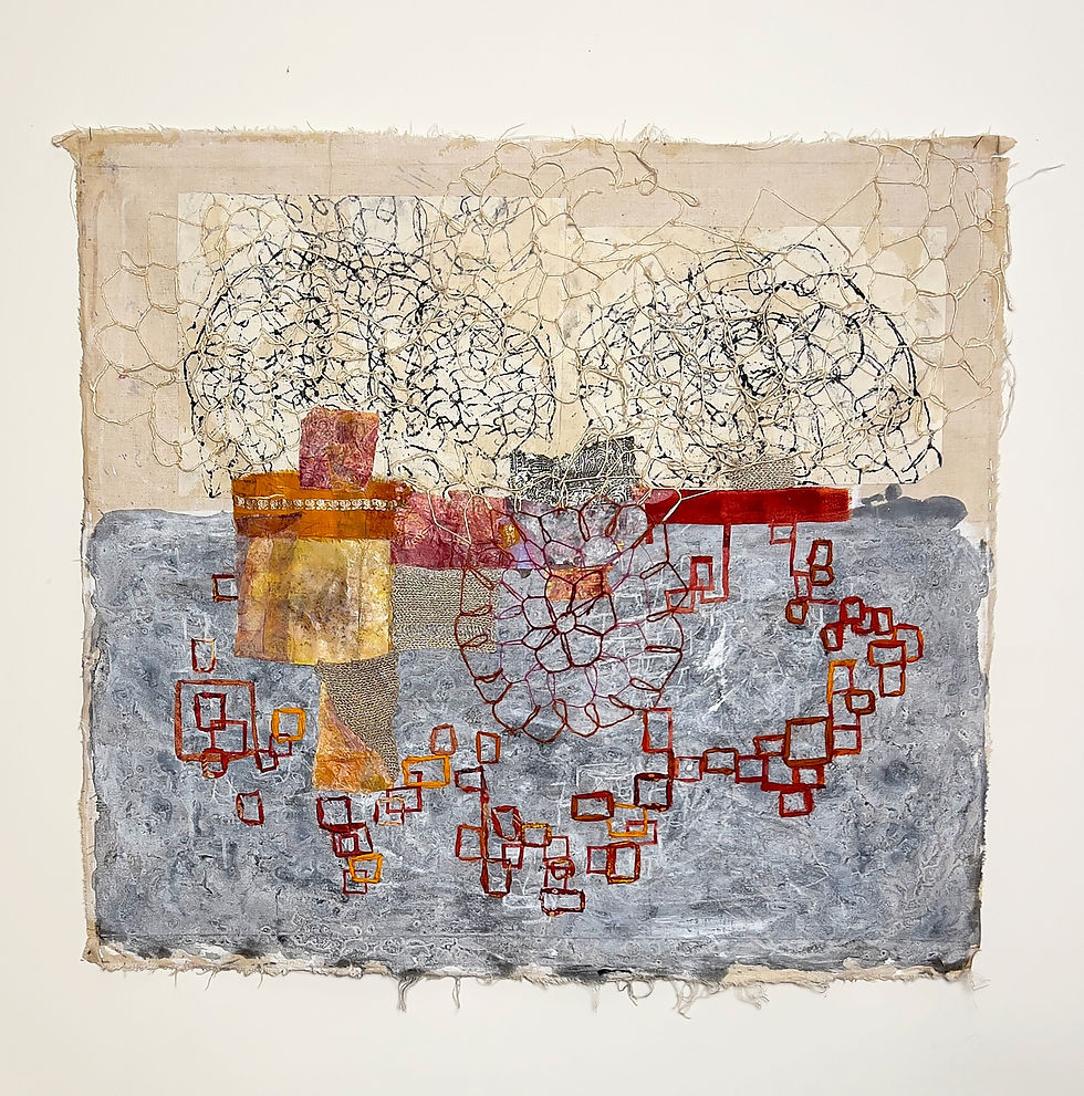 "My practice is grounded in interrelated bodies of nets and grids, through which I explore repair, transformation, and the veiled systems of connection that shape experience. These bodies of work are expressions of a consistent, evolving language, one that honors rupture and restoration. Whether through suspended net forms, gridded fiber-paper compositions, or participatory sound and stitching, my work seeks to soften hard systems, trace ancestral lines, and disrupt what no longer serves. Materials like sari silk passed down from my mother, thread, wire, and paper act as conduits for layered memory and embodied ideas. I integrate saris with wire. Cording silk with wire serves as a skeletal framework that is responsive to weight distribution. Together, these materials evoke containment and fluidity. I use netting and lacing techniques without a needle or substrate, then spiral this lace with wire to create cords of fiber that fix in form. Mending is central to my practice, serving as both metaphor and method. Acts of knotting, wrapping, and binding reflect the human instinct to restore what has been damaged. I use repeated circular nets and mirrors that reflect ourselves within the cycle of rupture and repair. Three frameworks shape my work: Weight, which encompasses physical and emotional mass; Waveform, the energetic space between interactions, echoing connection; and the Grid, which provides structure that I strive to remain fluid, interrupted, and responsive. Transforming inherited materials allows me to both honor and disrupt tradition. Wrapping becomes a ritual of reclamation; tearing, an intentional act of refusal. These gestures break the illusion of untouchable beauty and offer me agency and authorship; it is the process of my healing. Through the combination of fragility and strength, I offer a visual cyclical language for navigating dissonance and renewal. I invite the viewer to consider what holds them, and how we might begin to mend and renew."